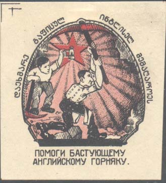 1926 г. Разм. 54 х 60 мм. Двухцветная печать на плотной различных цветов и качества. В центре в рамке сложной формы двое шахтеров в шахте за работой. Сверху полукругом текст на грузинском языке. Внизу текст в две строки: «Помоги бастующему английскому горняку». По углам знака разграничительные ли…