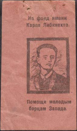 1920(?) г. Разм. 41 х 71 мм. Одноцветная печать на розовато-серой бумаге. В центре в прямоугольной рамке разм. 24 х 31 портрет К.Либкнехта. Сверху текст в две строки: «На фонд имени Карла Либкнехта». Внизу продолжение текста в две строки: «Помощи молодым борцам Запада».