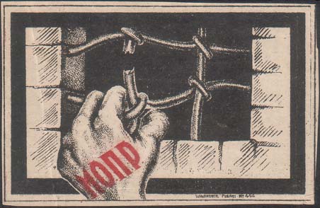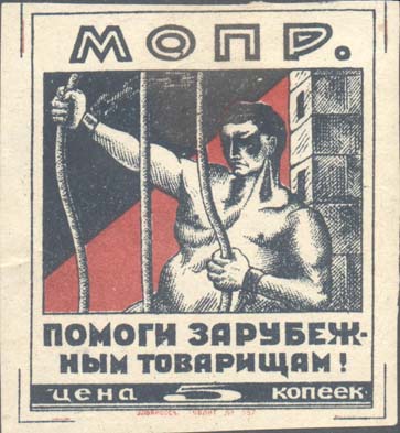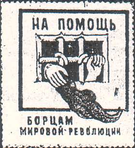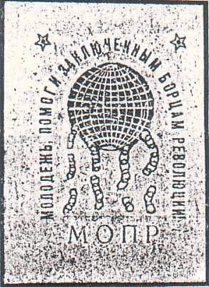 1930(?) г. Разм. рамки 52,5 х 60,5 мм. Двухцветная печать на белой бумаге. В прямоугольной рамке в центре дополнительная прямоугольная рамка, в которой заключенный разгибает прутья тюремной решетки. Сверху аббревиатура «МОПР». Внизу текст в две строки: «Помоги зарубежным товарищам!». Ниже номинал…