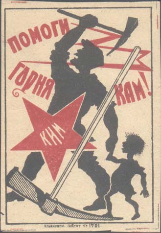1926 г. Разм. 55 х 80 мм. Двухцветная печать на желтоватой бумаге. В прямоугольной рамке разм. 50 х 74 мм на переднем плане пятиконечная звезда с аббревиатурой «КИМ» и кирка. На заднем плане силуэт шахтера с киркой, держащего за руку ребенка. Текст в две строки: «Помоги горнякам». Внизу под рамко…