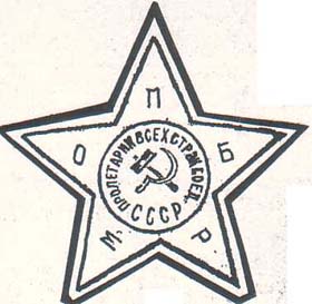 1923 г. Виньетка в форме пятиконечной звезды разм. 48 x 44 мм. Одноцветная печать на желтоватой бумаге. В рамке в форме пятиконечной звезды в центре в круглой рамке серп и молот. По внутреннему периметру круглой рамки текст: «СССР. Пролетарии всех стран, соед[иняйтесь].». В лучах звезды буквы абб…