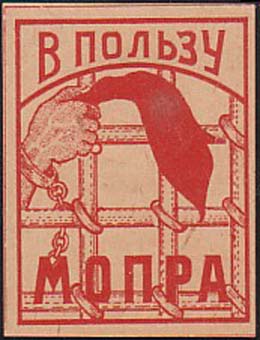 1931 г. 17.03.1931 г. Разм. 42 х 56 мм. Одноцветная печать на бумаге различных цветов. В прямоугольной рамке разм. 39 х 51 мм изображение руки узника в кандалах и с платком в окне с решет-кой. Сверху текст: «В пользу». Внизу продолжение текста: «МОПРА».