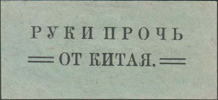 1930(?) г. Разм. 75 х 35 мм. Одноцветная печать на тонкой серо-зеленой бумаге. В центре текст в две строки: «Руки прочь от Китая».