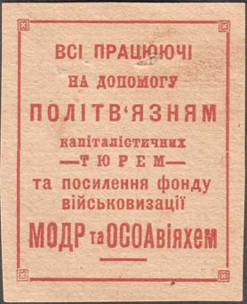 1930(?) г. Разм. 46 х 57 мм. Одноцветная печать на тол-стой желтоватой бумаге. В прямоугольной рамке разм. 40 х 49 мм с декоративными элементами по углам в центре текст в восемь строк на украинском языке: «Все трудящиеся на помощь политзаключенным капиталистических тюрем и усиление фонда военизац…