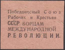 1923 г. Виньетка в форме флажка. Одноцветная двух-сторонняя печать на желтоватой бумаге. На лицевой стороне текст в пять строк: «Победоносный Союз Рабочих и Крестьян СССР борцам международной революции». На обороте текст: «Цена ... руб.».