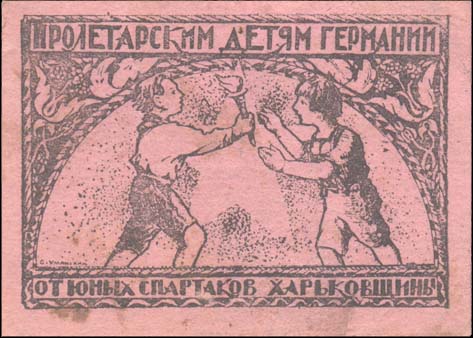 1926(?) г. Разм. 84 х 61 мм. Одноцветная печать на бумаге различных цветов. В прямоугольной декоративной рамке разм. 71,5 х 49,5 мм на фоне пятиконечной звезды один ребенок передает факел другому. Сверху текст: «Пролетарским детям Германии». Внизу продолжение текста: «От юных Спартаков Харьковщин…