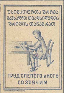 1931 г. Октябрь Разм. рамки 32,5 Х 48 мм. Одноцветная печать на белой бумаге. В прямоугольной рамке в центре слепой за столом. Внизу текст в две строки: «Труд слепого в ногу со зрячими». Сверху текст в три строки на грузинском языке. Слева внизу под рамкой выходные данные неразборчиво мелким шрифт…