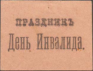 1915(?) г. Разм. 52 х 39 мм. Одноцветная печать на бумаге различных цветов. В центре текст в две строки: «Праздник День Инвалида».