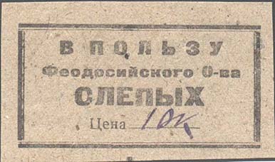 1933 г. Январь Разм. 65 х 40 мм. Одноцветная печать на светло-серо-коричневой бумаге. В двойной прямоугольной рамке разм. 30 х 58 мм текст в четыре строки: «В пользу Феодосийского о-ва слепых Цена ...(прописью от руки)».