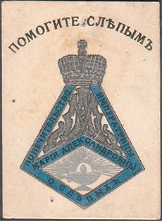 1914 г. Разм. 38 х 52 мм. Трехцветная печать на плотной белой бумаге. В центре эмблема попечительства. Сверху полукругом текст: «Помогите слепым».