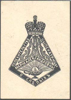 1912(?) г. Разм. 31 Х 43 мм. Одноцветная печать на желтоватой бумаге. В центре знак Попечительства Императрицы Марии Федоровны о глухонемых.