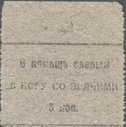 1925(?) г. Разм. 52 х 52 мм. В двойной прямоугольной рамке разм. 41 х 46 мм в центре текст в три строки: «Спасибо за помощь». По углам номинал. По периметру между рамками текст: «Не сожаление к слепым а организованная помощь».