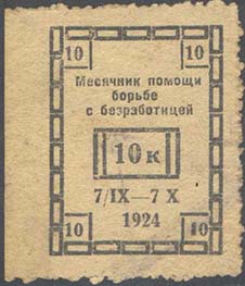 1924 г. 07.09.–07.10.1924 г. Разм. рамки 26 х 36 мм. Одноцветная печать на плотной желтоватой бумаге. Нерегулярная зубц. В центре прямоугольной декоративной рамке с номиналами по углам номинал в дополнительной прямоугольной рамке. Сверху текст в три строки: «Месячник помощи борьбе с безработицей».…