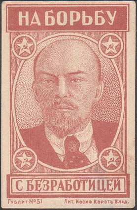 1928(?) г. Разм. 42 х 67 мм. Одноцветная печать на белой бумаге. в центре в овальной рамке разм 39 х 48 мм портрет В.И.Ленина. Сверху в прямоугольной рамке текст: «На борьбу». Внизу продолжение текста: «С безработицей». По внутренним углам рамки в круглых рамках пятиконечные звезды. Внизу под рам…