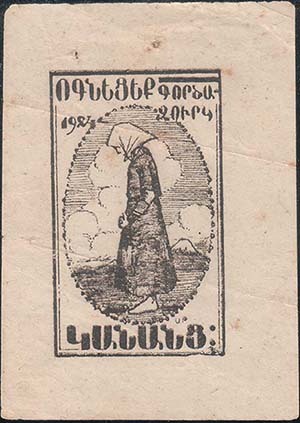 1924 г. Разм. 50 х 69 мм. Одноцветная печать на белой бумаге. В центре в двойной прямоугольной рамке разм. 23,5 х 47,5 мм женщина на фоне горы Арарат и облаков. Сверху текст на армянском языке в две строки. Внизу текст на армянском языке.