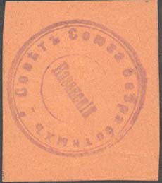 1917(?) г. Разм. 44 х 44 мм. Одноцветная печать на бумаге различных цветов. Фиолетовый оттиск круглой печати с текстом: «Казанский Совет Союза безработных».