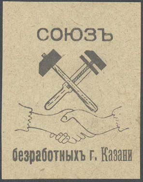 1917 г. 14. 04. 1917 г. Разм. 56 х 67 мм. Одноцветная печать на бумаге различных цветов и качества. В центре скрещенные молоток и разводной ключ. Ниже две руки, соединенные в рукопожатии. Текст в две строки: «Союз безработных г. Казани».