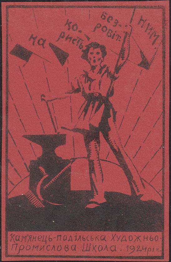 1924 г. Разм. рамки 50 х 72 мм. Одноцветная печать на бумаге различных цветов. В двойной прямоугольной рамке рабочий у наковальни со знаменем на фоне восходящего солнца. На знамени текст: «Безработным». Внизу текст в две строки на украинском языке: «Каменец-Подольская Художественно-Промыш[ленная]…