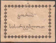 1925(?) г. Разм. 36 х 28 мм. Одноцветная печать на желтоватой бумаге. В центре в прямоугольной рамке разм. 31 х 22 мм текст в две строки на грузинском языке: «В пользу г. Гори».