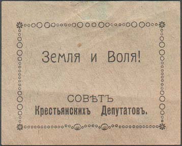 1919 г. 22.03.1919 г. Разм. 60 х 48 мм. Одноцветная печать на тонкой зелено-серой бумаге. В прямоугольной рамке разм. 50 х 36 мм из различных декоративных элементов сверху текст: «Земля и Воля!». Внизу текст в две строки: «Совет Крестьянских Депутатов».