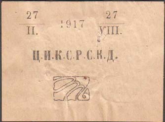 1917 г. 27.II. – 27.III.1917 г. Разм. 55 х 41 мм. Одноцветная печать на тонкой желтоватой бумаге. В центре аббревиатура: «Ц.И.К.С.Р.С.К.Д.». Сверху дата: «27/II – 27/III». Внизу декоративный элемент.