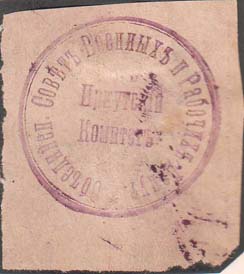 1918 г. Разм. 40 х 45 мм. Одноцветная печать на тонкой серой бумаге. На лицевой стороне фиолетовый оттиск круглой печати диаметром 35 мм. На печати текст: «Объединен[ый]. Совет Военных и Рабочих Депут[атов]. Иркутский Комитет».