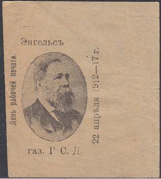 1917 г. Разм. 50 х 58 мм. Одноцветная печать на тонкой желтоватой бумаге. В центре портрет Ф. Энгельса. По периметру текст: «День рабочей печати. Энгельс. 22 апреля 1912-1917 г.».