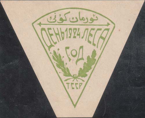 1924 г. Виньетка сложной формы разм. 80 х 70 мм. Одноцветная печать на бумаге различных цветов. В рамке сложной формы разм. 49 х 60 мм в центре текст в две строки: «День леса 1924 год». Сверху текст на татарском языке арабским шрифтом. Внизу венок из дубовых веток и аббревиатура: «ТССР».