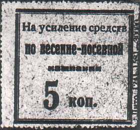 1931 г. 02.04.1931 г. Разм. рамки 40 х 39 мм. Одноцветная печать на толстой коричнево-оранжевой бумаге. Нерегулярная зубц. В двойной прямоугольной рамке сверху текст в три строки: «На усиление средств по весенне-посевной кампании». Внизу номинал. Справа с наружной стороны рамки вертикально выходны…