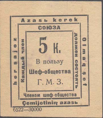 1932 г. 25.09.1932 г. Разм. 61 х 68 мм. Одноцветная печать на желтоватой бумаге. В центре в тройной прямо-угольной рамке разм. 47 х 54 мм текст в четыре строки: «5 к. в пользу Шеф-общества Г.М.З.». По периметру между рамками текст на русском и татарском (латинской шрифтом) языках: «Каждый член сою…
