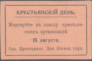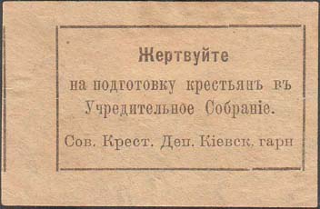 1917 г. Разм. 59 х 38 мм. Одноцветная печать на тонкой сероватой бумаге. В центре в прямоугольной рамке разм. 46 х 27 мм текст в три строки: «Жертвуйте на подготовку крестьян в Учредительное Собрание». Внизу текст: «Сов[ет]. Крест[ьянских]. Деп[утатов]. Киевск[ого]. Гарн[изона].».