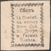 1919 г. 14.09.1919 г. Одноцветная печать на толстой сероватой бумаге. В декоративной рамке разм. 22 х 29 мм в центре текст в семь строк: «Сбор 14 Сентяб[ря]. в пользу Всер[оссийского]. Сов[ета]. Кр[естьянских]. Депут[атов]. и гарниз[онного]. Совета».