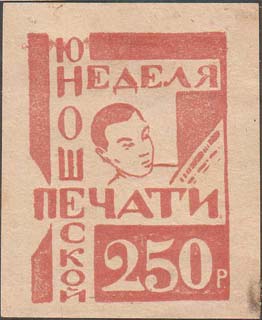 1923 г. Разм. 44 х 53 мм. Одноцветная печать на тонкой желтоватой бумаге. Разм. рис. 34 х 45 мм. В центре в декоративной рамке молодой человек читает газету. По периметру текст: «Неделя юношеской печати». В правом нижнем углу номинал.