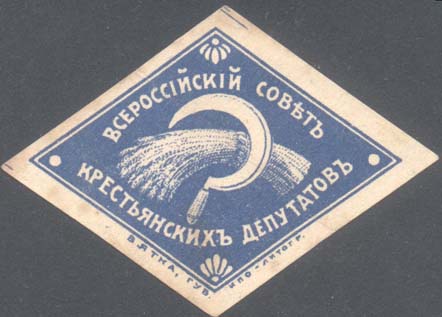 1917 г. 15.08.1917 г. Ромб разм. 74 х 53 мм. Одноцветная печать на плотной белой бумаге. В рамке в форме ромба разм. 63 х 45 мм на сплошном фоне серп и сноп пшеницы. Сверху полукругом текст: «Всероссийский совет». Внизу полукругом продолжение текста: «Крестьянских депутатов». По внутренним углам р…