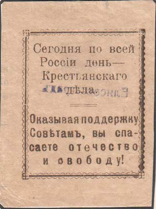 1917 г. 15.08.1917 г. Разм. 51 х 68 мм. Одноцветная печать на тонкой серой бумаге. В прямоугольной декоративной рамке разм. 41 х 49 мм в центре декоративный элемент в виде двух штрихов. Сверху текст в четыре строки: «Сегодня по всей России день – Крестьянского дела». Внизу текст в четыре строки: «…