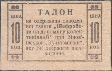 1932 г. Разм. 62 х 39 мм. Одноцветная печать на толстой кремовой бумаге. Мелкая нерегулярная просечка. В прямоугольной рамке разм. 53 х 32 мм в центре текст в восемь строк на украинском языке: «Талон на приобретение однодневной газеты «Шефработа на помощь коллективизации» при Зиновьевской «Культс…