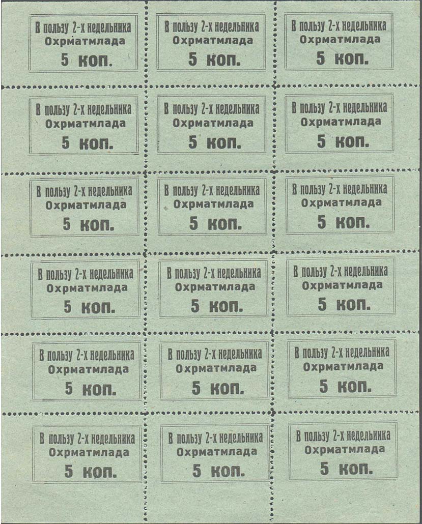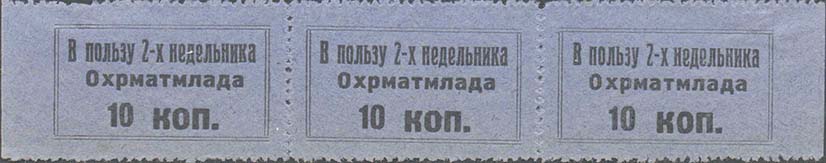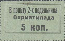 1929 г.   Разм. рамки 36 х 19,5 мм. Зубц. Одноцветная печать на бумаге различных цветов. В двойной прямоугольной рамке текст в две строки: «В пользу 2-х недельника охрматмлада». Внизу номинал.