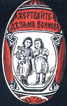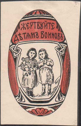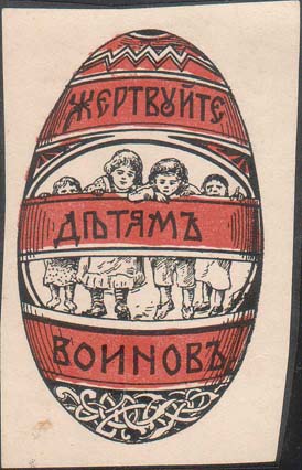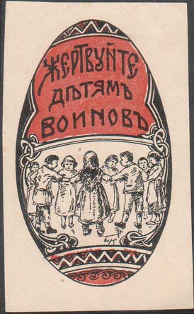 1915(?) г. Виньетки в форме пасхальных яиц разм. 38 х 63 мм. Двухцветная печать на белой бумаге. В центре дети, орнамент и текст: «Жертвуйте детям воинов».