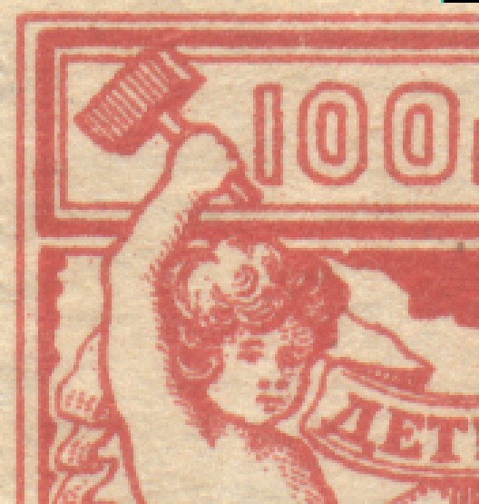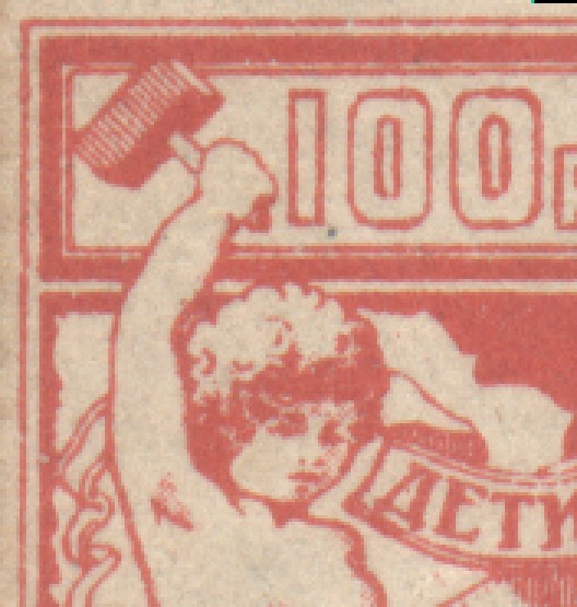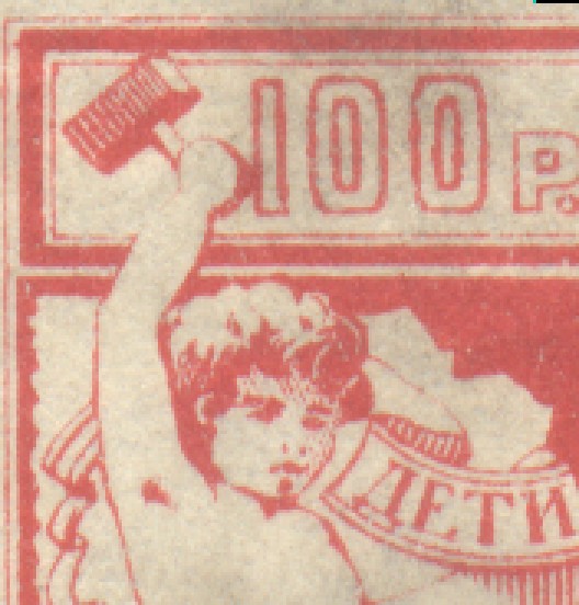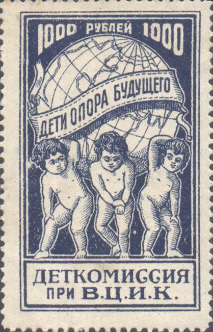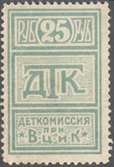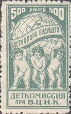 1923 г. Октябрь Первый всероссийский выпуск. Одноцветная печать на белой (оттенки) бумаге. Зубц 11 1/2. С клеем. Внизу текст в две строки: «Деткомиссия при В.Ц.И.К.». Существуют три типа клише.