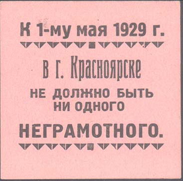 | Разм. 61 х 60 мм. В центре текст в пять строк: «К 1-му мая 1929 г. в г. Красноярске не должно быть ни одного неграмотного». | |||||||
