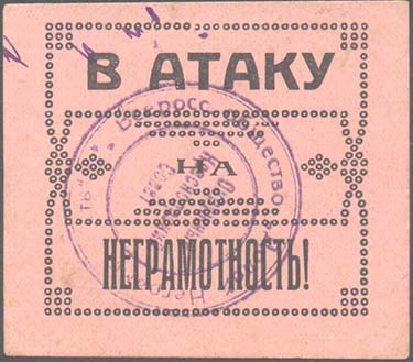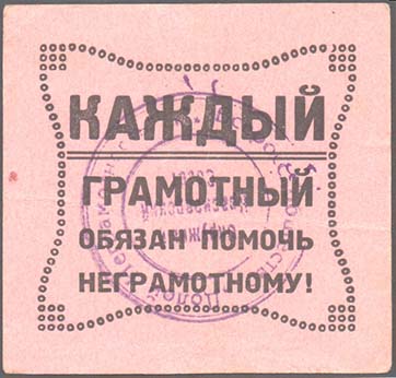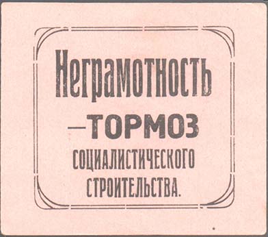 | Разм. 66 х 58 мм. В центре в двойной рамке с закругленными углами разм. 50 х 45 мм текст в четыре строки: «Неграмотность – тормоз социального строительства». | |||||||