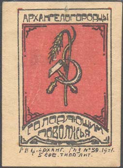 1921 г. 25.09.1921 г. Разм. рамки 32,5 х 47 мм. Трехцветная печать на толстой бежевой бумаге. В двойной прямоугольной рамке аллегорические рисунки, символизирующие победу над голодом. Внизу под рамкой в две строки выходные данные мелким шрифтом: «Р.В.Ц. Арханг. Гиз. №58. 1921. 5 сов. Типо-лит.». Сверху текст: «Архангелогородцы». Внизу продолжение текста в две строки: «Голодающим Поволжья».