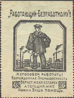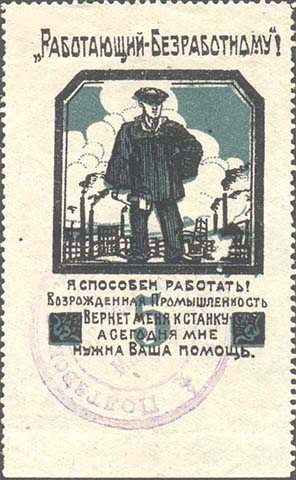 1924 г. Разм. 46 х 63 мм. Двухцветная печать на сероватой бумаге. Зубц. 11 1/2. В центре в фигурной рамке фигура рабочего на фоне завода. Сверху текст: ««Работающий - Безработному»». Внизу текст в пять строк: «Я способен работать! Возрожденная Промышленность Вернет меня к станку, а сегодня мне нужна Ваша помощь».