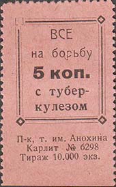 1929 г. Разм. 28 х 45 мм. Одноцветная печать на бумаге различных цветов. Зубц. 14 1/2. В двойной прямоугольной декоративной рамке в центре номинал. Сверху текст в две строки: «Все на борьбу». Внизу продолжение текста: «С туберкулезом».