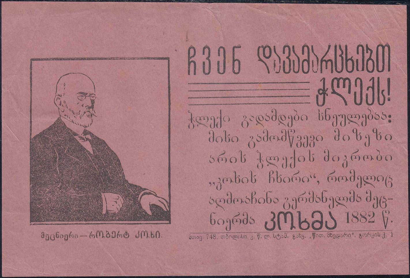 1931(?) г. Листок разм. 179 х 124 мм. Одноцветная печать на тонкой бумаге различных цветов. Слева в рамке разм. 50 х 58 мм портрет Роберта Коха. Справа текст в восемь строк на грузинском языке. В правом нижнем углу под чертой выходные данные мелким шрифтом на грузинском языке.