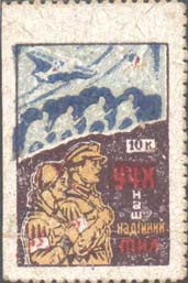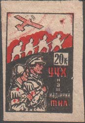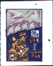 1932 г.   Разм. рамки 23 х 32 мм. Многоцветная печать на белой (оттенки) бумаге. В центре слева на темном фоне юноша и девушка с повязками с красным крестом на рукавах. Справа номинал и текст в три строки. Сверху на холме цепь красноармейцев с винтовками наперевес. Сверху в небе на силуэт самолета и разрыв шрапнели.