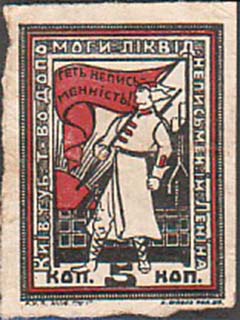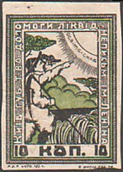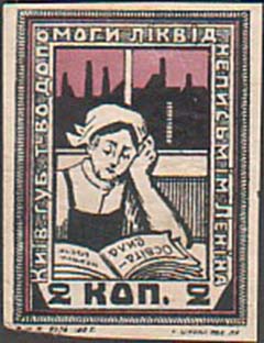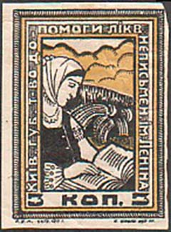 1925 г.   Двухцветная печать на белой бумаге. В прямоугольной декоративной рамку различные сюжеты. По внутреннему периметру рамки текст на украинском языке: «Киев[ское]. Губ[ернское]. О-во помощи ликвид[ации]. неграмотности им. Ленина». Внизу номинал. Внизу под рамкой выходные данные мелким шриф-том неразборчиво.
