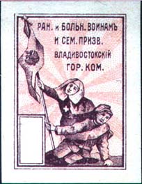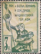 1914 г.   Разм. рамки 26,5 х 37,5 мм. Двухцветная печать на белой бумаге. Зубц. 11 1/2. С клеем. В прямоугольной рамке в центре сестра милосердия и раненый со знаменем на фоне лучей солнца. Сверху текст в четыре строки: «Ран[еным]. и больн[ым]. воинам и семьям призв[анным]. Владивостокский Гор[одской]. Ком[итет].». Слева внизу в прямоугольной рамке номинал.