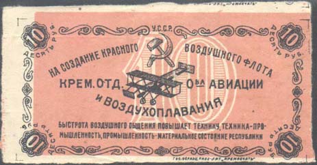 1923 г. Двухцветная печать на белой бумаге. В центре на фоне крупной цифры номинала в декоративной рамке самолет-биплан, снижающийся влево. Сверху серп и молот. В центре текст в три строки: «У.С.С.Р. На создание Красного Воздушного Флота Крем[енчугского]. Отд[еления]. О-ва Авиации и воздухоплавания». Под рамкой выходные данные: «Гос. образц. типолит. «Кремпечать».