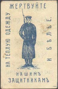 1916(?) г. Разм. 32 х 49 мм. Одноцветная двухсторонняя печать на бумаге различных цветов. На лицевой стороне в центре различные сюжеты. По перимет-ру текст: «Жертвуйте на теплую одежду и белье нашим защитникам». На оборотной стороне текст в семь строк: «Тверской отдел О-ва Повсеместной Помощи Больным и Раненым Воинам».